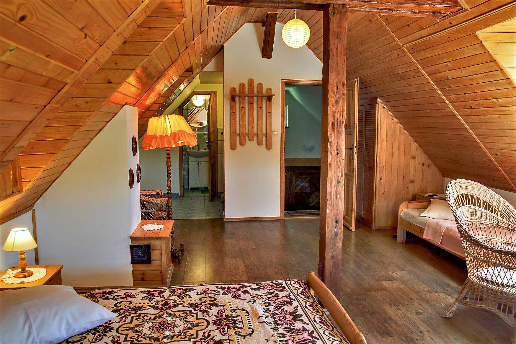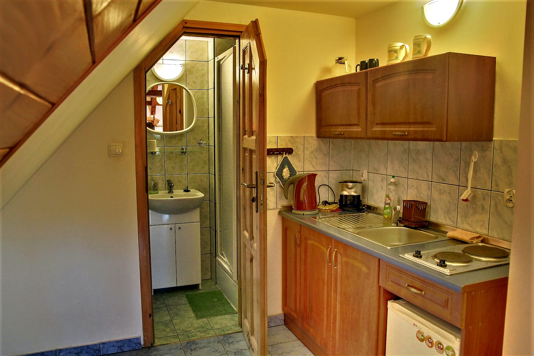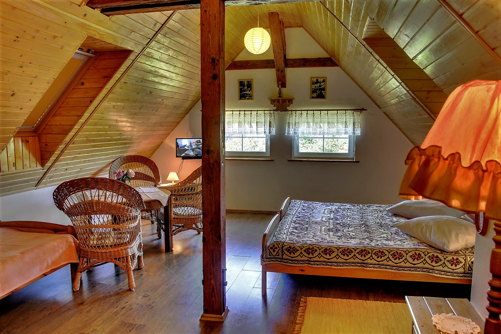 Pokój „Andrzej” znajduje się na poddaszu domu. Choć posiada „skosy”, jest przestrzenny i przyjmie 3 osoby. Okna dachowe zapewniają dostatek światła we wnętrzu, zaś aneks kuchenny oraz łazienka dopełniają komfortu. Możliwa „dostawka”.